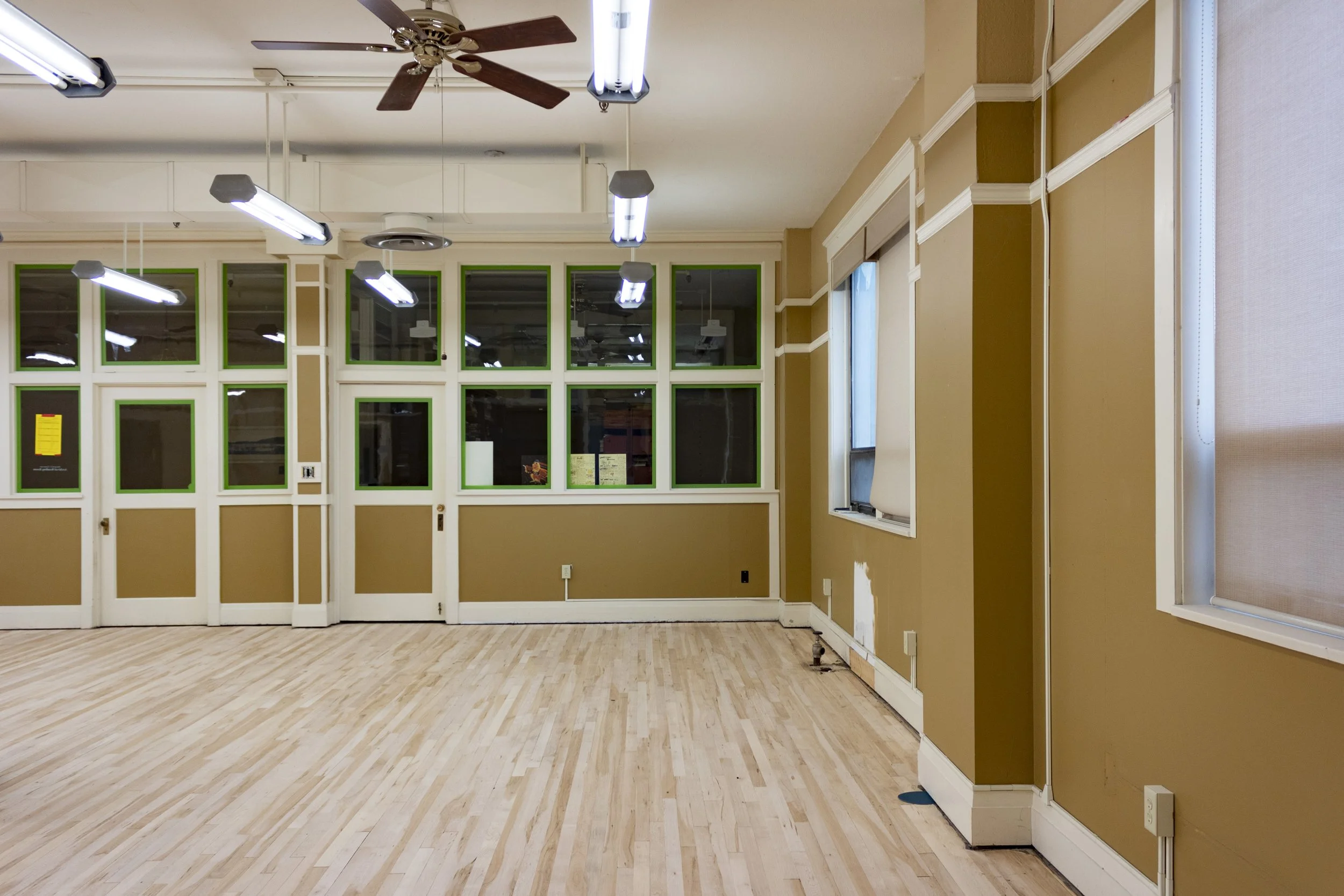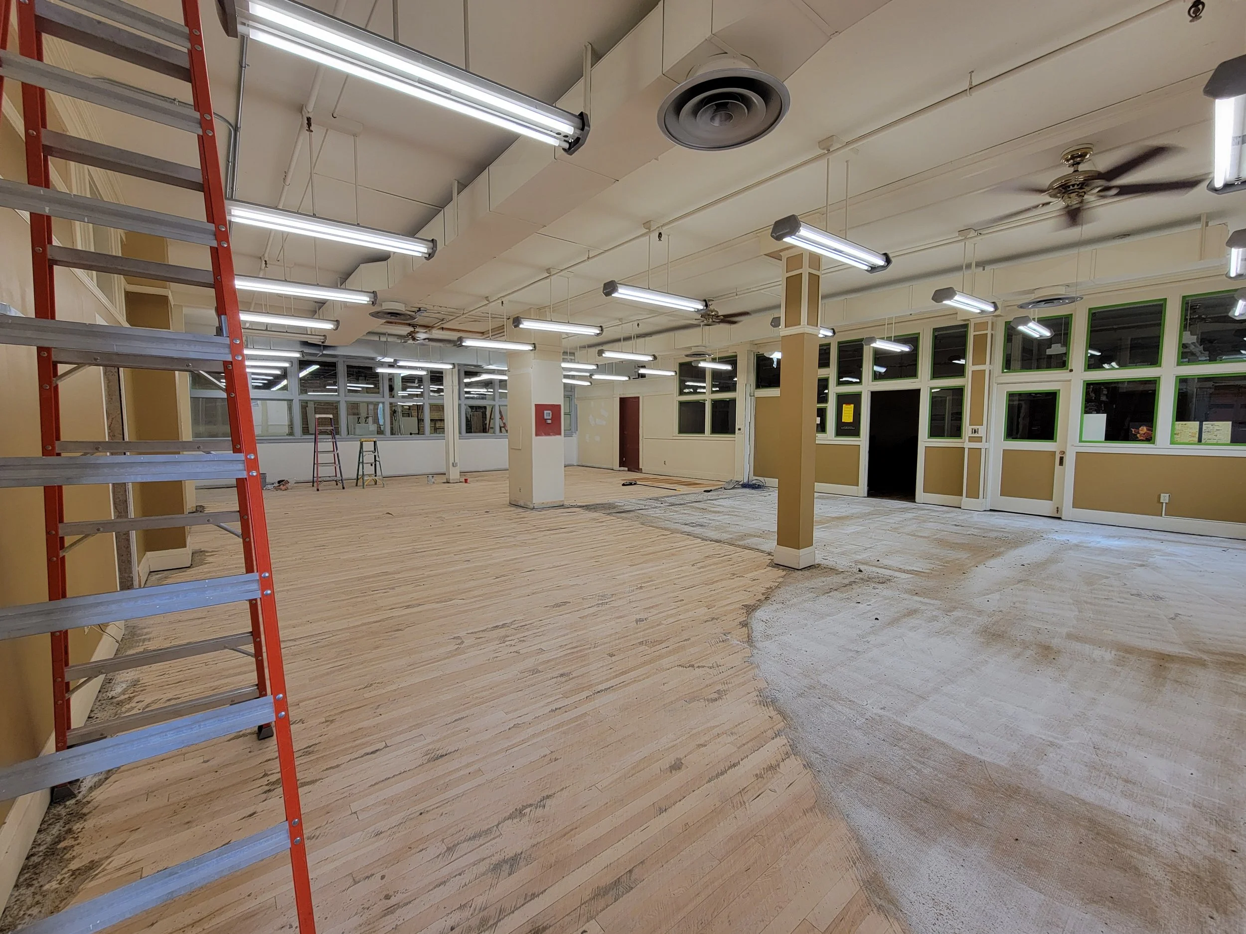 The highlight of May's construction progress is certainly the restoration of our wood flooring! The carpet tear-up revealed layers of old linoleum, carpet glue, and tar paper! Hours of sanding and glue removal came next, meanwhile mudding, taping, and painting progressed on the drywall. The floor received two coats of stain, and as soon as it was dry enough, protective paper went down. We will see the beautifully restored maple floor again when the final sealer coat is applied, which will come after door installation, new trim, painting, and electrical work is completed.