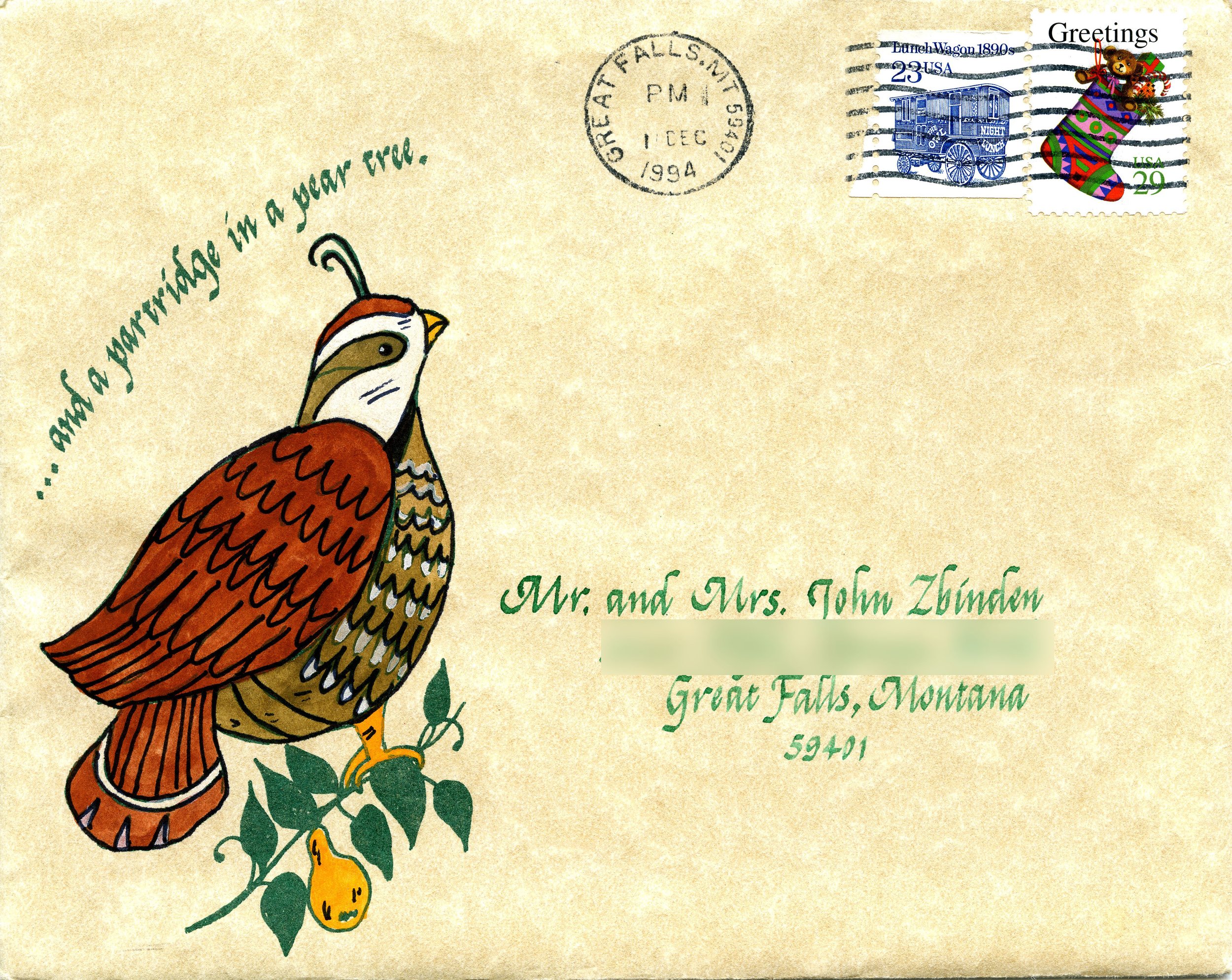 Dale and Chuck Lewis were married in 1951. She was a schoolteacher and Chuck was a railroad dispatcher. Their love for Christmas characterized their lives together. They started a Christmas collection in 1951 with a set of flying reindeer and Santa that they ordered from a J. C. Penny mail order catalog. Over the next 50 years, they decorated their home inside and out each Christmas. A cornerstone of their Christmas tradition was Dale’s handmade Christmas cards. Dale was known for her calligraphy, and you can see why!