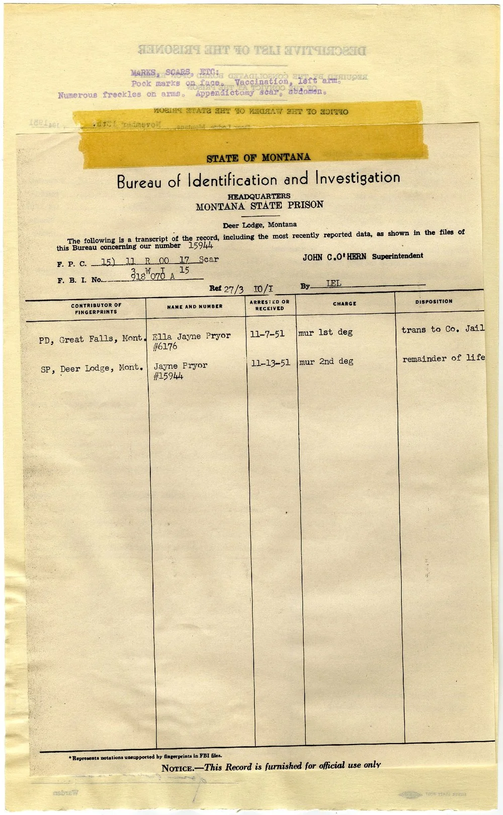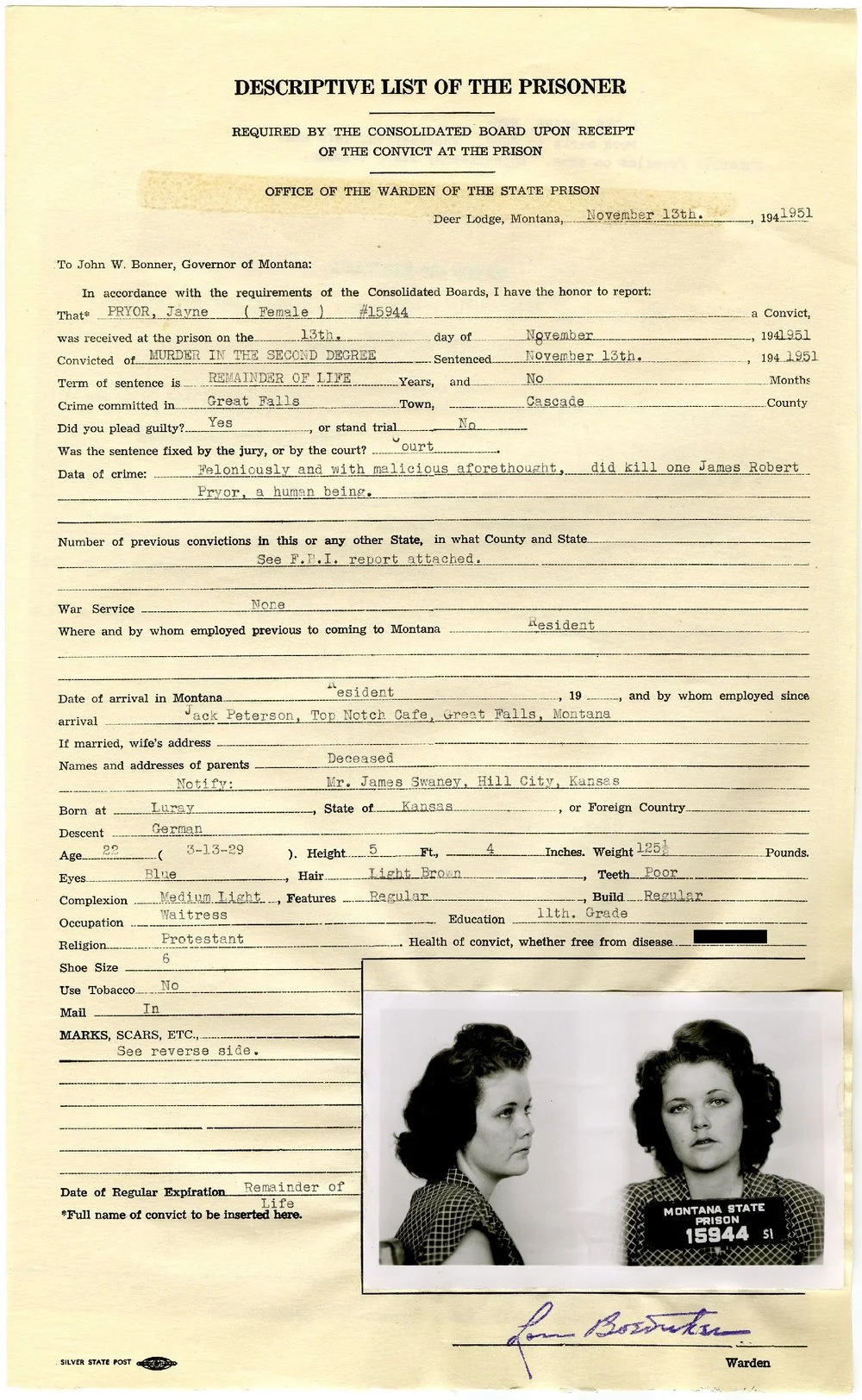 Janye Pryor’s Prison paperwork, Record Series 197 (Montana State Prison Records), Montana Historical Society, p. 1